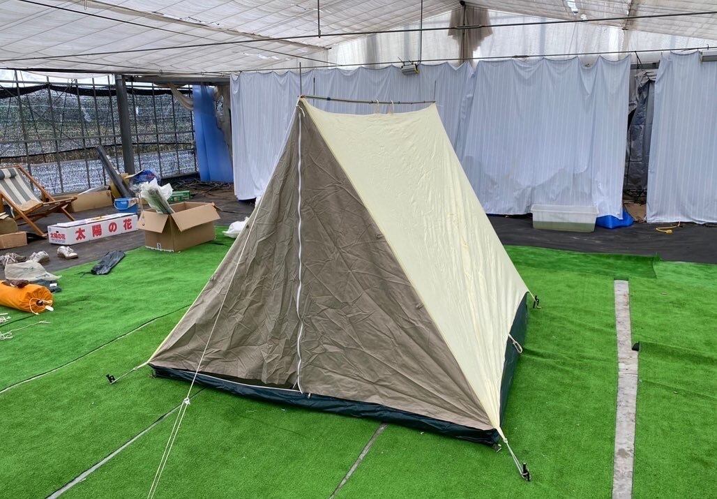 コットン製のストームテントです。設営も簡単で、これからの季節におすすめです。大人2人くらいのサイズですが、プラスお子さん1人くらいでも使用していただけると思います。